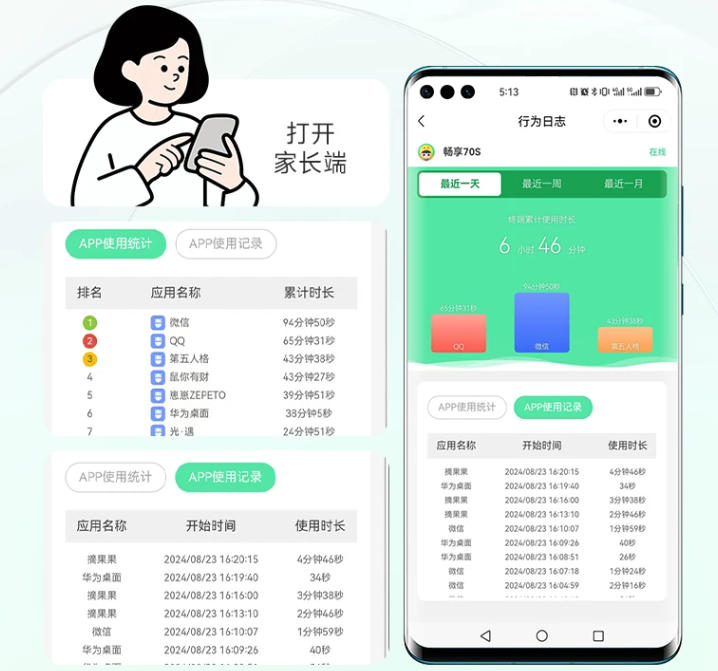 便于家长查看孩子每天的学习和娱乐情况,养成良好的使用习惯。