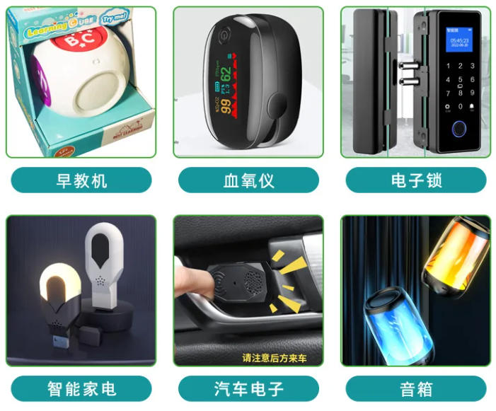 产品应用:电子琴、儿童学习机、防盗设备、智慧家电等