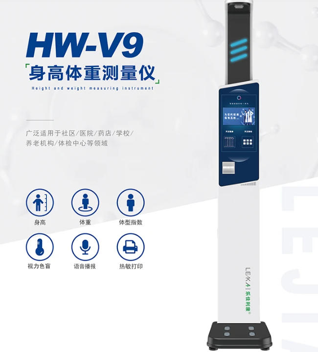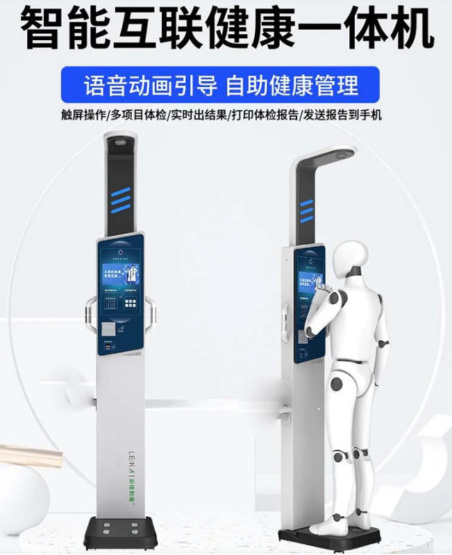 触屏式自助测量各项健康指标,同步智能引导式,操作简单