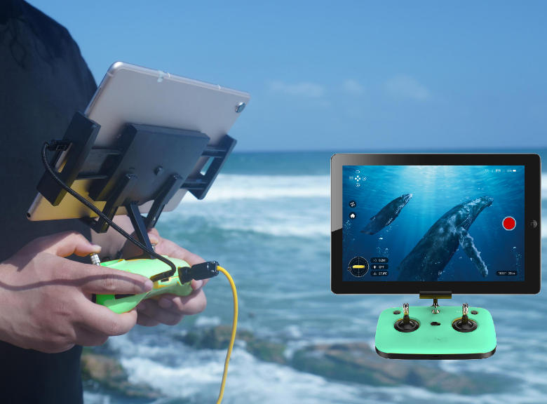 采用智能控制算法,实现机器在水中 0~100 米任意深度悬停定深拍摄,可实现机器±45°俯仰拍摄和 360°自由旋转,并在水中任何深度自动定深,精准悬停灵活性更强,捕捉更丰富的水下影像。